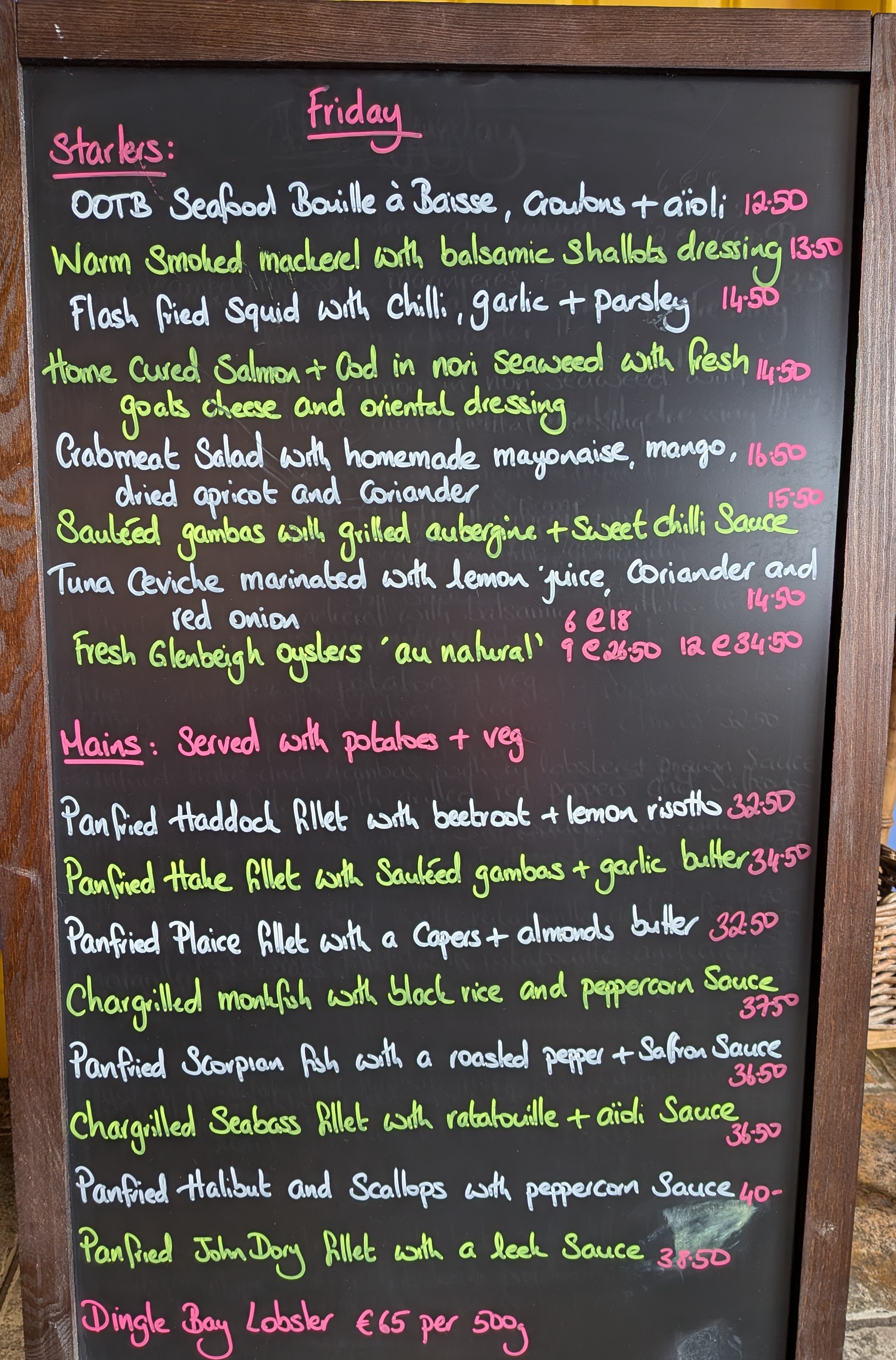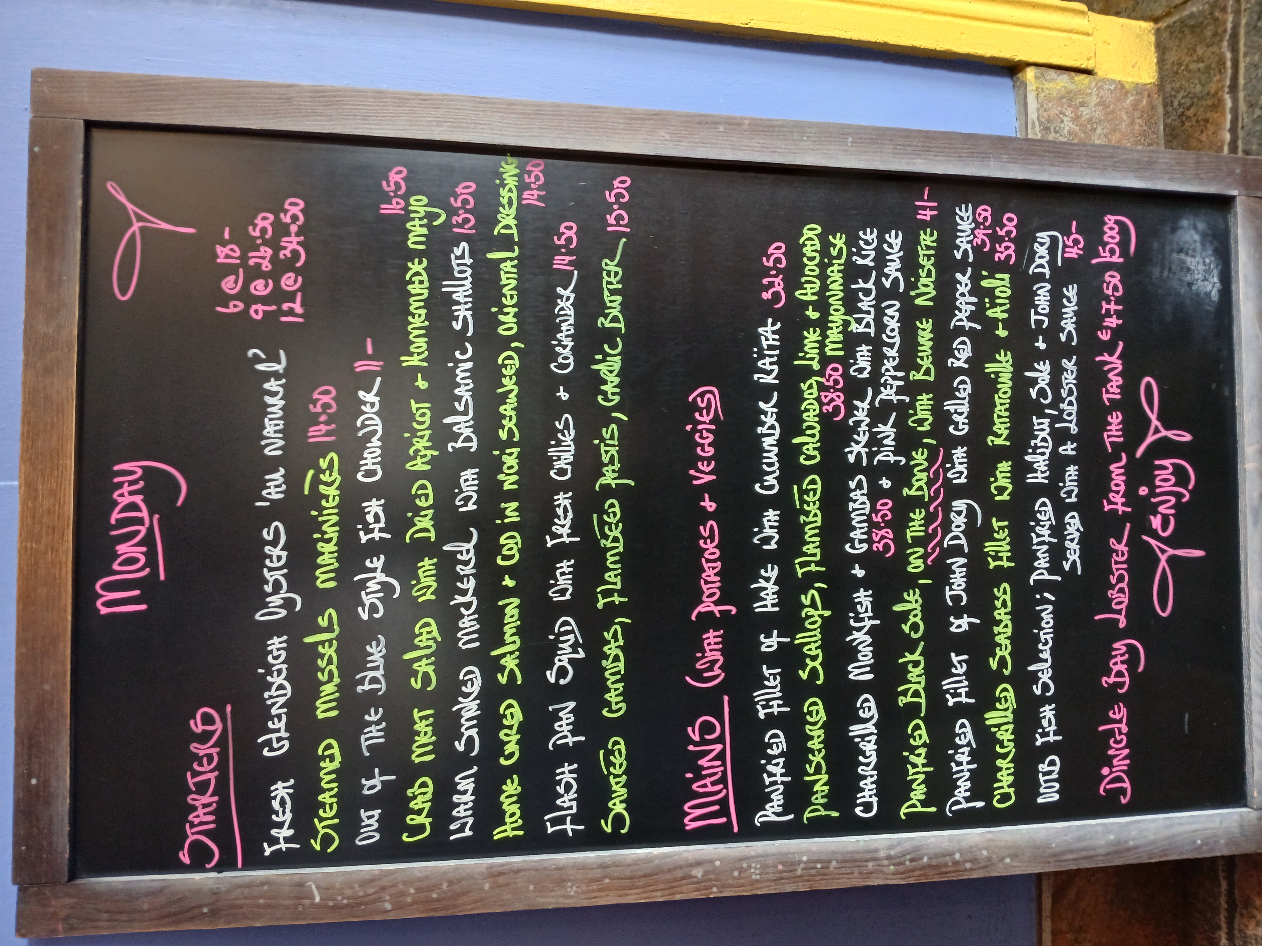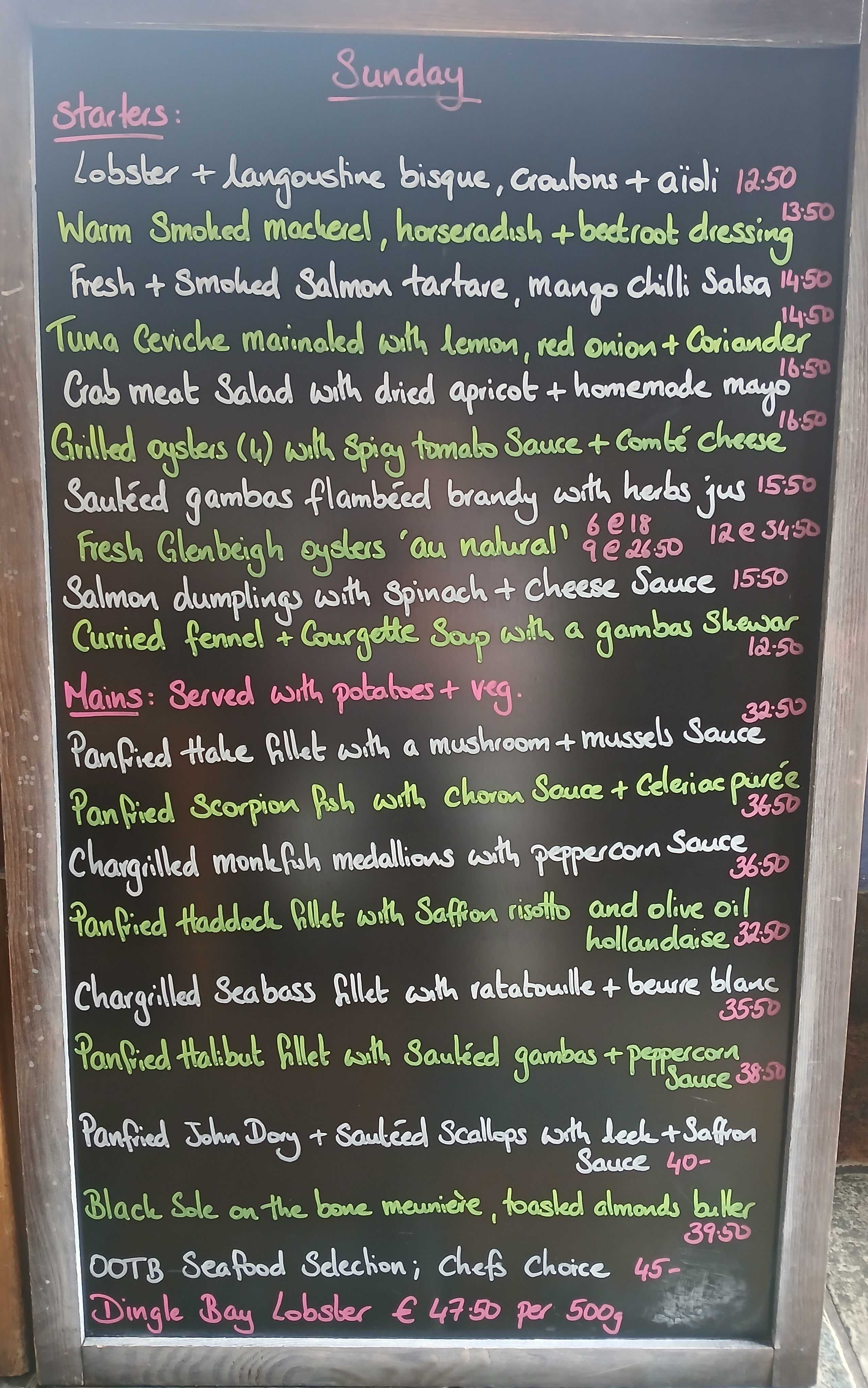 Our menus change daily depending on the catch - head over to our Instagram page @ootbdingle for more current sample menus.